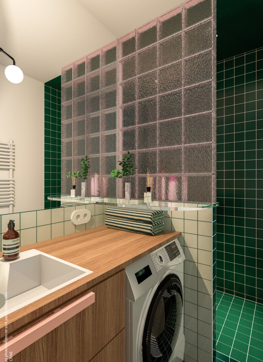 Terminons notre visite par la pièce voisine, la salle de bain. Proche d’une inspiration des années 80s, le vert des joints de la faïence côtoie un rose opaque et / ou transparent.