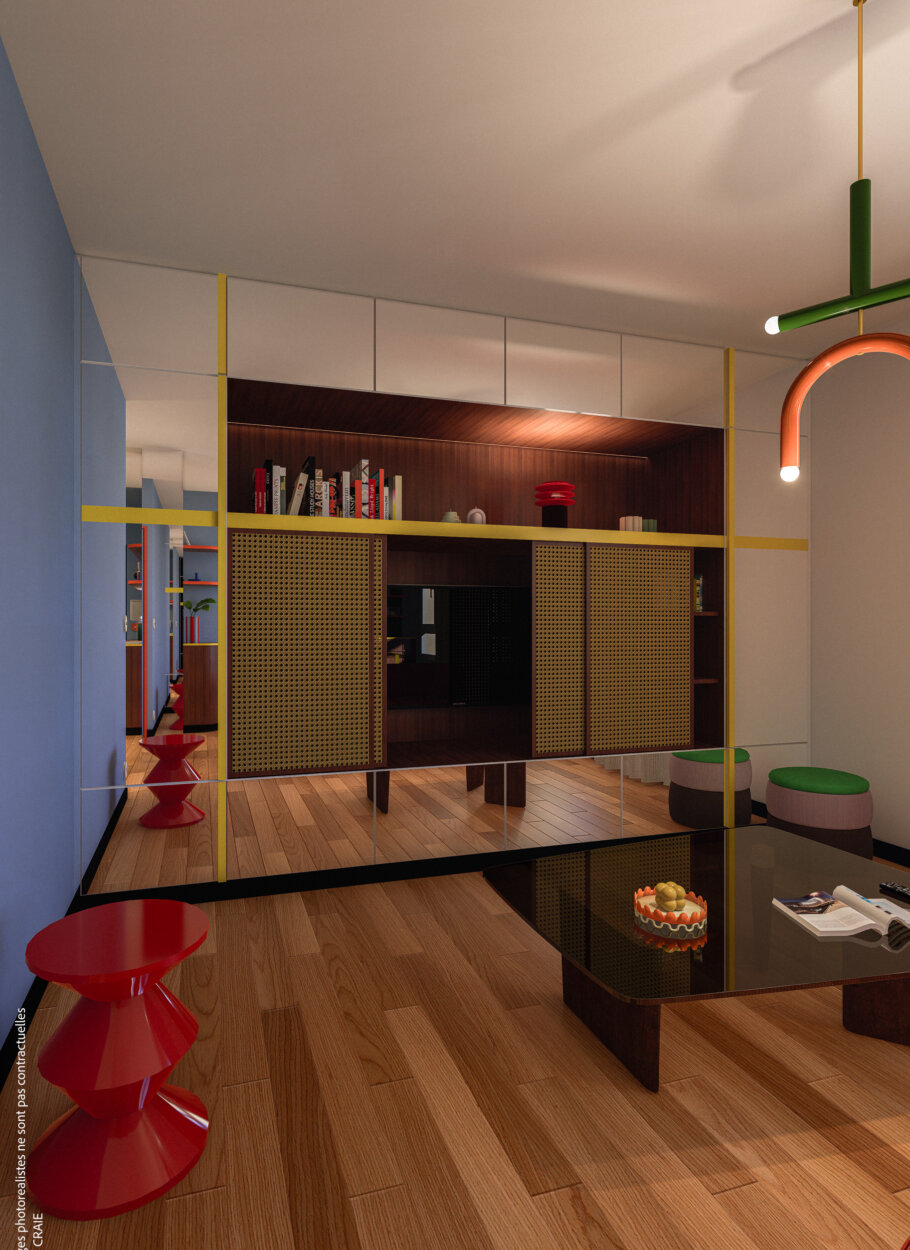 Ouverte sur le séjour, celle-ci dialogue avec l’espace qui lui fait face par le biais de façades miroirs. Occupant le fond de la pièce, les rangements abritent une bibliothèque ainsi qu’une télévision pouvant être occultées grâce à des portes en cannage rappelant l’usage dans l’entrée.