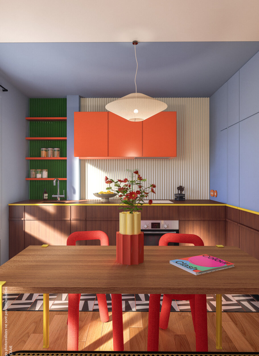 Suivons le fil jaune, pour s’aventurer vers la cuisine. La dominante de bleu et bois accueille des teintes d’orange, de vert et de jaune assimilés à différents matériaux. Toujours dans la pureté de la ligne, la crédence reprend les codes de la tôle ondulée pour apporter du volume au mur. L’horizontalité des rangements orange géométrisent l’ensemble pour faire apparaître une planche tendance grandeur nature.